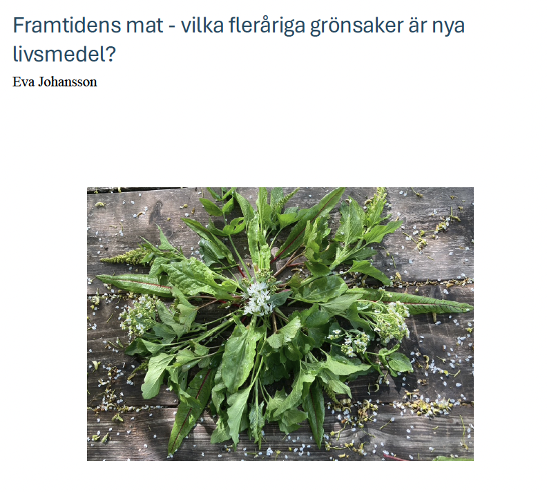 Intresset för nya grödor som fleråriga grönsaker är stort men det är en utmaning att veta vilka som är godkända livsmedel. För att skydda konsumenter ska alla nya livsmedel (novel food) granskas och godkännas innan de får säljas. I tidningar och böcker förekommer många förslag på fleråriga grönsaker som nya spännande grödor. För den enskilda husbehovsodlaren kan dessa vara av intresse för privatkonsumtion men för yrkesodlare och mathantverkare gäller att veta vilka arter som får säljas som livsmedel. Fleråriga grönsaker är en heterogen grupp både vad gäller historisk användning och status (novel food eller inte). Projektet har sammanställt fleråriga grönsaker som är godkända, som inte får säljas som livsmedel och som behöver granskas vidare.